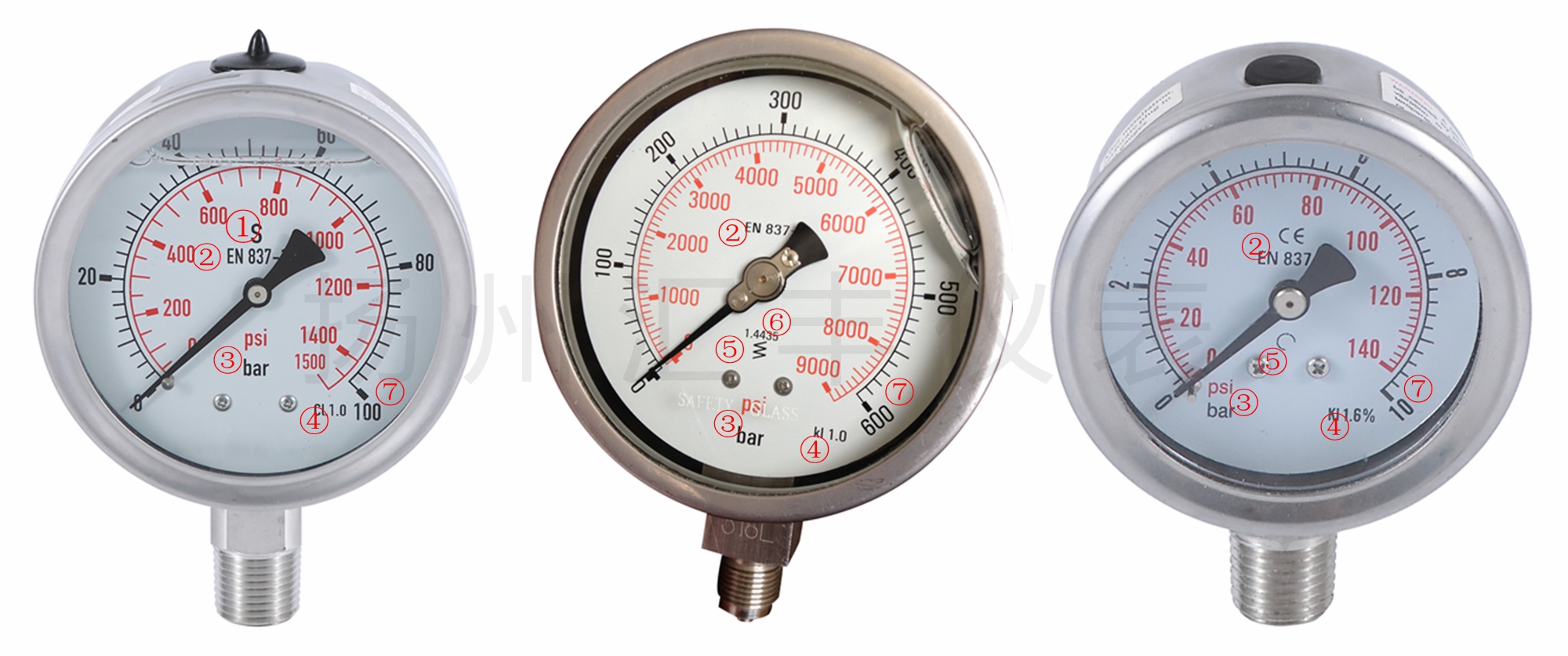④表示壓力表的精度等級,1.0表示誤差在滿量程的1%。普通壓力表精度有1.0,1.6,2.5,4.0,精密壓力表的誤差要小于1.0。國內標準壓力表在精度等級外面加一個圓圈表示精度,EN837標準壓力表多用CL或KL加精度等級表示精度。